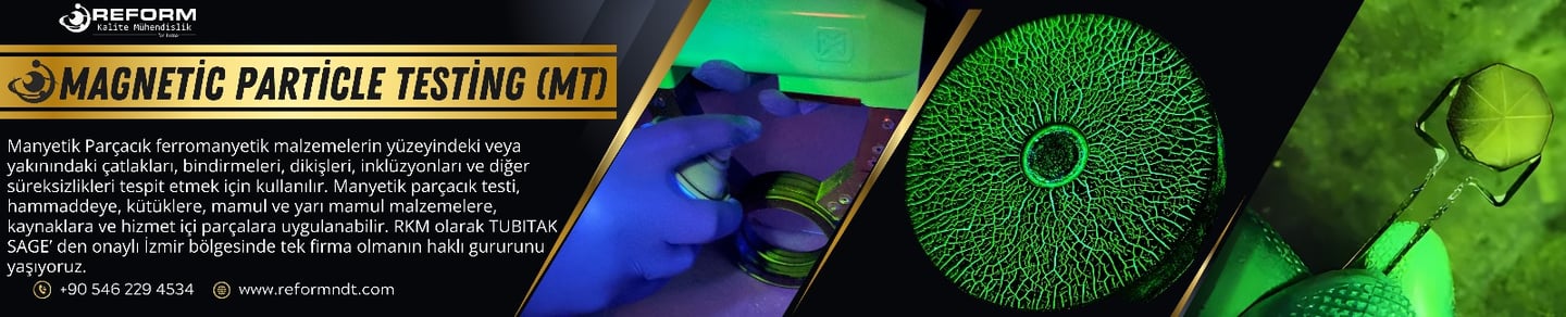 Manyetik parçacık, genellikle demir, nikel veya kobalt gibi ferromanyetik malzemelerden üretilen ince taneli bir test ortamıdır. Uygulanan manyetik alanın etkisiyle bu parçacıklar, malzeme yüzeyinde ve yüzeye yakın bölgelerdeki süreksizliklerin çevresinde toplanarak kusurların görünür hale gelmesini sağlar. Manyetik parçacıklar, manyetik parçacık muayenesi (MT) gibi tahribatsız muayene (NDT) yöntemlerinde kullanılır ve ferromanyetik malzemelerdeki yüzey ve yüzeye yakın çatlak, kırık ve benzeri kusurların tespitinde önemli rol oynar. Firmamızda kullanılan manyetik parçacıklar ve gerçekleştirilen manyetik parçacık muayenesi süreçleri, ASTM E1444 standardına uygun olarak kontrol edilmektedir.